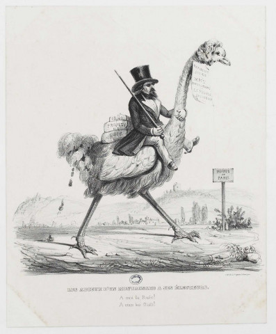 Portrait (caricature) de Sommier (représentant du peuple à l'Assemblée nationale), à cheval sur une autruche qui défèque, et au cou de laquelle est accroché un panneau avec le texte suivant : "République sociale - Impot sur les riches - Le peuple souverain". Derrière Sommier, et sur le dos de l'animal, 3 livres intitulés : "1849 Projets de Lois". En arrière-plan, un décor de campagne avec sur la droite un panneau indiquant : "Route de Paris".