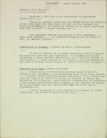 1S30 (1) : Dames patronnesses de la crèche Bersot, tutelle morale : extrait du rapport à M. Maudet (?), correspondance, modèle de formulaire, compte-rendu de réunion [12 pages, manque la 9] (1919). 1S30 (2) : Famille Veil-Picard : portrait de M. Veil-Picard (1888), brochure « Centenaire du Grand philanthrope Adolphe VEIL-PICARD (1824-1877), Banquier à Besançon, Protecteur des Arts et des Lettres 18 mai 1924 » (1924). Crèche Bersot : photographies de groupe des enfants de la crèche, d'enfants prenant des bains, salle des landaus et dortoir (s.d., 1921, 1928) ; cartes postales de la crèche Bersot : « Après la Sieste », « Rêverie », bâtiment (s.d.) ; carte d'identité vierge des Pupilles de la Nation ; image pieuse annotée « Souvenir de Sœur Eleuthère à son élève Panier Adèle » (s.d.). Crèche Bersot et crèche du Canton Nord, statistique : fréquentation et mortalité 1918-1927. 1S30 (3) : Crèche Bersot, installation de toilettes pour les enfants : correspondance (1904), compte de l'année 1903 ; Bulletins de la Société des Crèches (national) n°106 (1902) [Fragile, des pages se détachent] ; liste des Œuvres de Bienfaisance privée reconnues d'utilité publique (1919) ; correspondance, note sur les obsèques de M. Bersot (1888), historique de la crèche (10 pages). Ecole Maternelle Rue Battant : correspondance (1894).