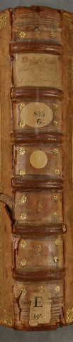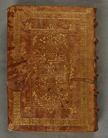 Reliure parisienne, veau, à décor doré, première moitié du XVIe siècle, réalisée pour le cardinal Antoine de Granvelle : un encadrement de petits fers avec fleur de lis à chaque angle extérieur ; décor losange/rectangle et étoile à 6 branches avec aigle bicéphale couronnée à chaque angle du rectangle, fers pleins, fers courbes ; tranches sont dorées et ciselées ; titre de l'ouvrage peint en or sur bande de pourpre en haut de la tranche de gouttière