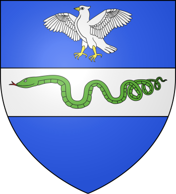 Blason de la famille Cousin (de Nozeroy) "D'azur à la fasce d'argent, chargée d'un serpent ondoyant en fasce de sinople, (à la queue enroulée trois fois), (langué de gueules), et accompagnée en chef d'une colombe essorante d'argent, (becquée et membrée d'or)"