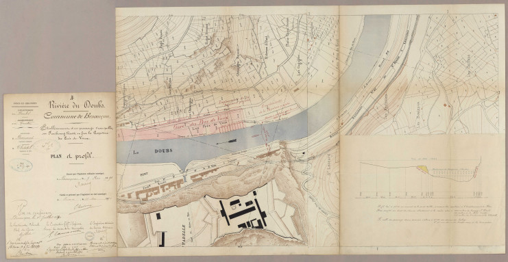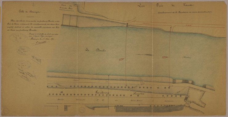 Passerelle de Rivotte, plan pour l’établissement d’un passage d’eau public au faubourg Rivotte en face la papeterie des Prés-de-Vaux, dressé le 7 mai 1890, Archives municipales, 3S24