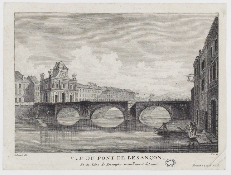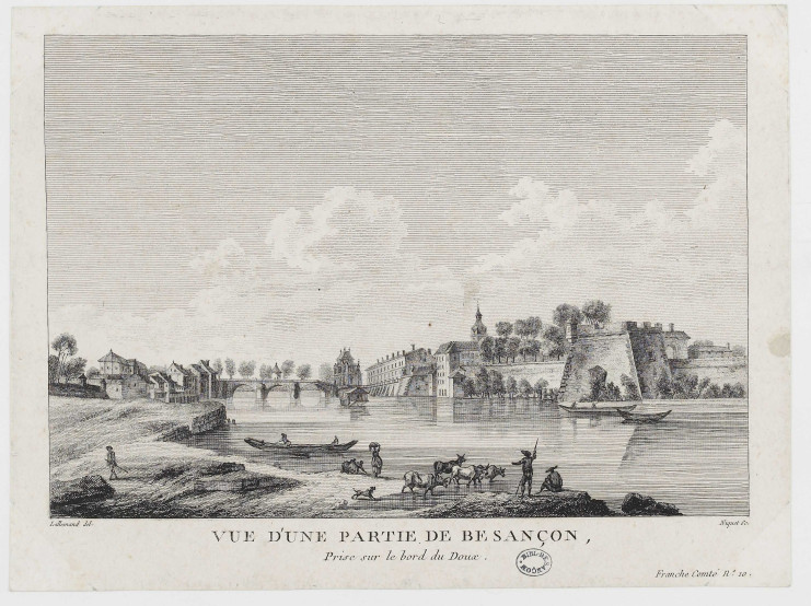 Passage d’eau établi au niveau de la patache d’Arènes, Vue d'une partie de Besançon, prise sur le bord du Doux, XVIIIe siècle, Bibliothèque municipale, EST.FC.1109 (1)